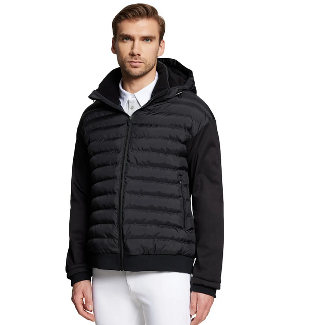 Jaqueta masculina Sloane em softshell bimaterial. Projetada para cavaleiros que buscam praticidade e estilo em um corta-vento quente com capuz, ideal para uso na arena e no dia a dia.