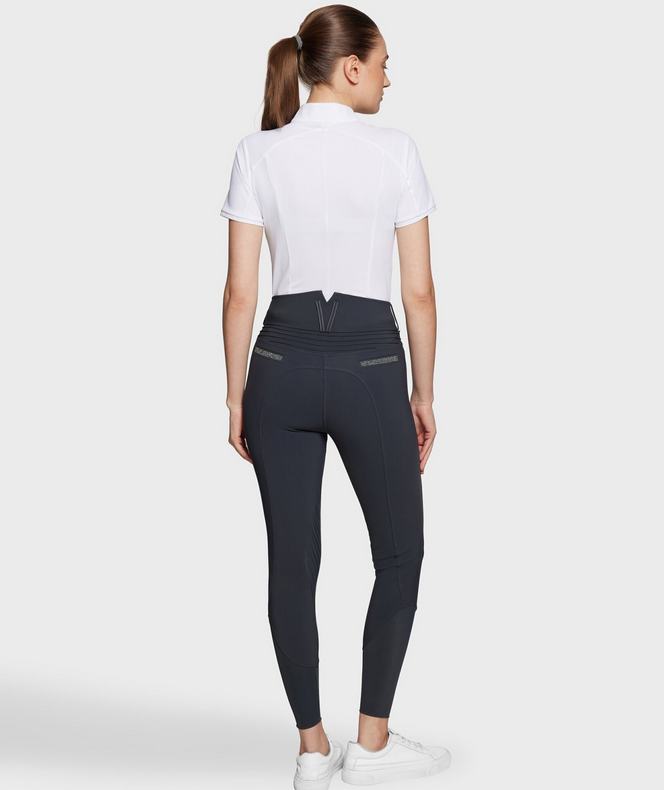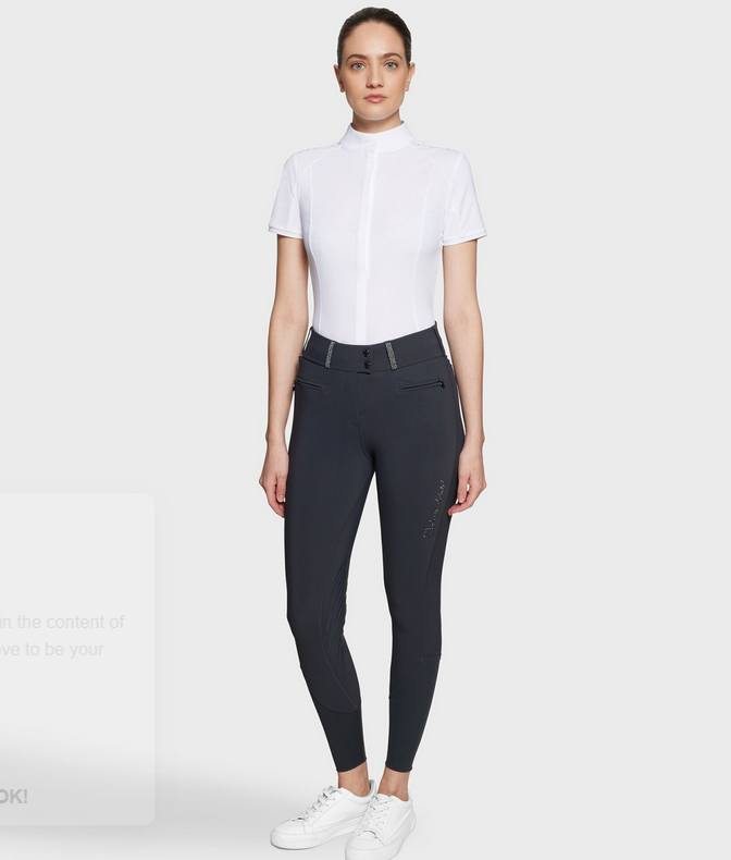 Design elegante com logótipo Swarovski na coxa e detalhes em cristal nos bolsos.