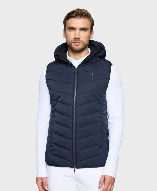 Jaqueta masculina Albertville sem mangas, com capuz removível. Projetada para cavaleiros exigentes que desejam se manter secos e aquecidos durante treinos e competições equestres, além de oferecer conforto térmico e proteção contra o vento no dia a dia.