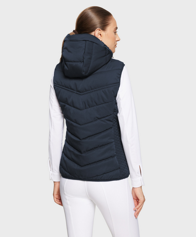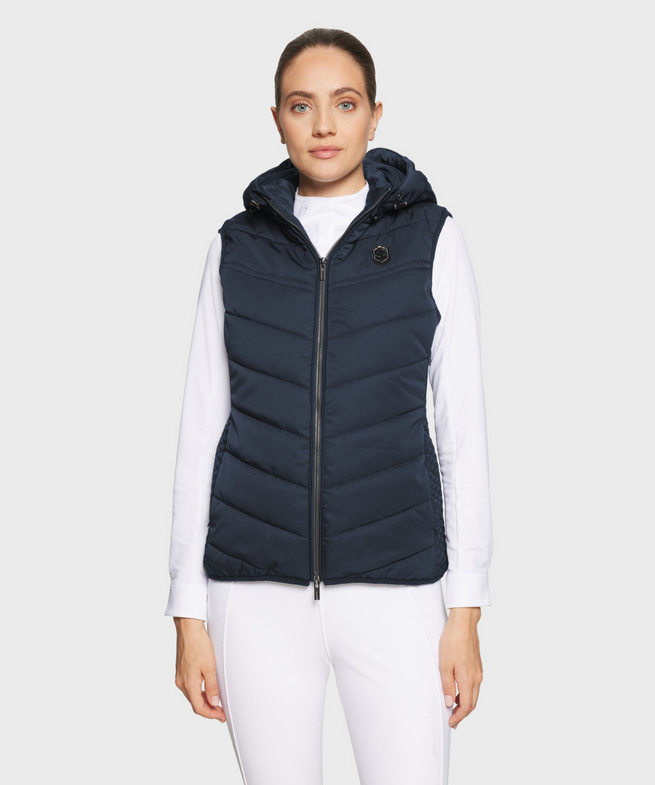 Colete de plumas sem mangas com capuz removível para mulheres em Val d’Isère. Projetada para amazonas exigentes que desejam se manter secas e aquecidas durante treinos e competições equestres, mas também para conforto térmico e proteção contra o vento no dia a dia.