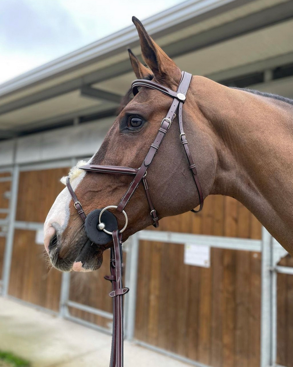 Focinheira encimadas por cabedal quadrado cosido a branco. As fivelas são em aço inox.