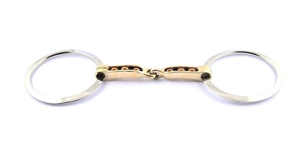 Os anéis grandes e planos oferecem melhor suporte ao cavalo e proporcionam um leve efeito de alavanca. Os canhões quadrados com arruelas de cobre promovem o relaxamento.