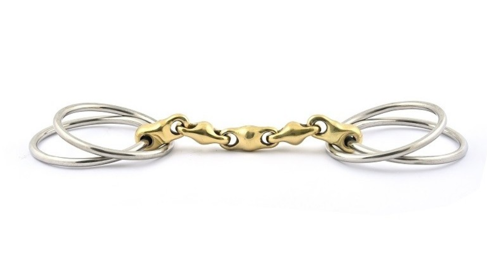 Canhoneira esférica que permite a divisão dos pontos de contato. Os dois anéis livres são fixados aos suportes verticais e os dois anéis da canhoneira são fixados às rédeas.