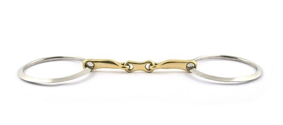 Os anéis grandes e planos proporcionam melhor controle do cavalo e oferecem um leve efeito de alavanca. As bordas pronunciadas e o perfil fino da embocadura conferem a este freio muito mais ação. A articulação dupla alivia a pressão no palato.