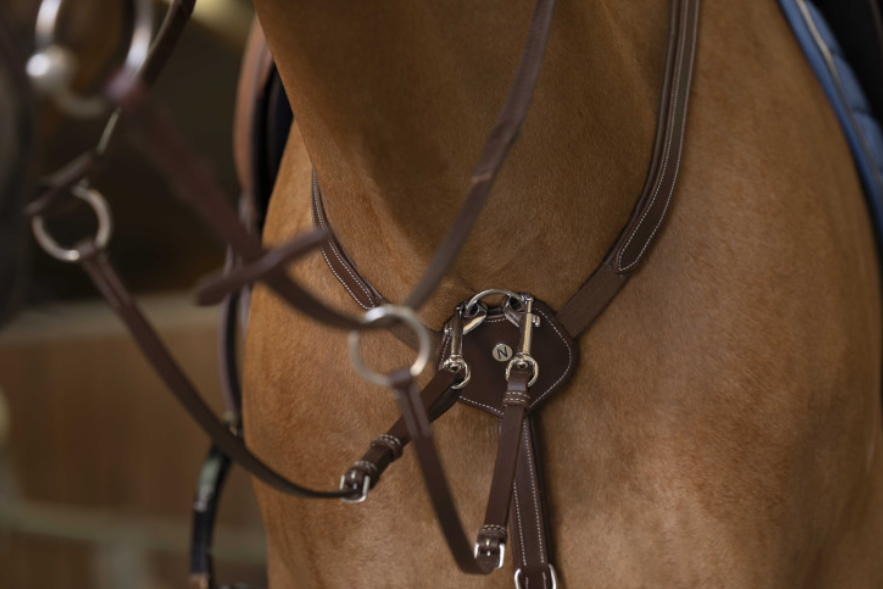 Peitoral em couro de búfalo forrado com couro de vaca, com martingal. Costuras pretas para o couro preto e costuras creme para o couro havana. Fivelas em inox.