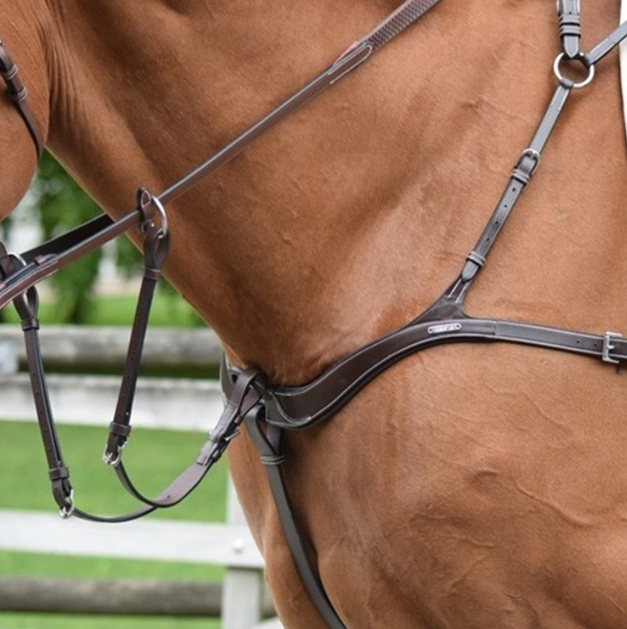 Esta couraça é fruto da experiência da Jump’In. Ela se fixa em cinco pontos diferentes: duas fixações de cada lado da cilha, duas fixações nos anéis sob as pequenas abas e uma fixação na própria cilha.