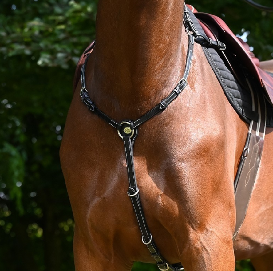 Combinando com a cabeçada Monday, este peitoral prende-se às correias da cilha da sela e apresenta o mesmo padrão pequeno e contrastante. O peitoral ajuda a manter a sela firmemente no lugar durante toda a cavalgada, evitando que ela deslize para trás.