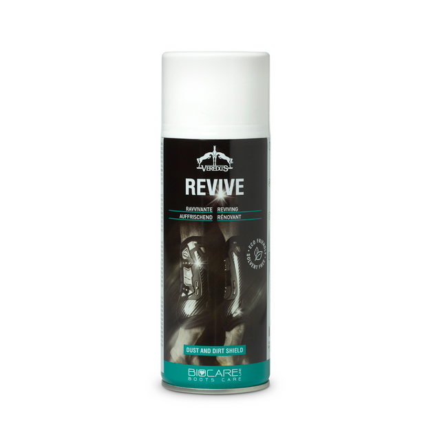 O Revive Spray é o produto ideal para a manutenção de proteções e outros acessórios para cavalos. Ele dá novo brilho às botas e age como um polidor e protetor contra poeira e sujeira.